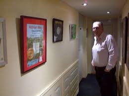 De gang bevat fotocollecties en CD’s die onderscheiden zijn. Vijfentwintig jaar zingen met gevoel. Aan de wand. Adrian staat er trots bij, maar ook weer heel gewoon.